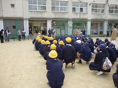 豊崎本庄小学校の6年生と一緒に、豊崎中学校の教室で授業を受けました。