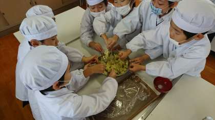 1.2年生で協力して育て、収穫したサツマイモを使い、調理していきます。
