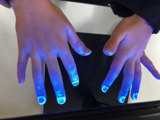 さあ、洗った手をブラックライトにかざしてみましょう。