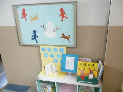 今日のお昼の本読みは,「国語教科書に出てくる物語」の中から,「はじめは『や!』」というお話でした。はじめは友だちではなかったくまときつねが少しずつ友だちになっていく様子がえがかれていました。2階の図書スペースには,学校図書館補助員さんが「ともだち」についての本を並べてくださっています。