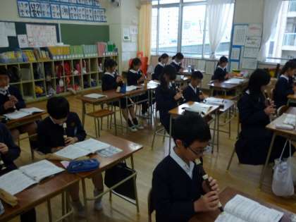 音楽が流れると体を動かしている児童、聞いたことがあるという顔をしている児童など