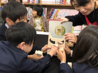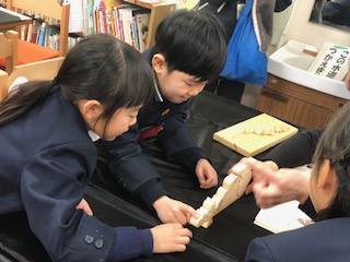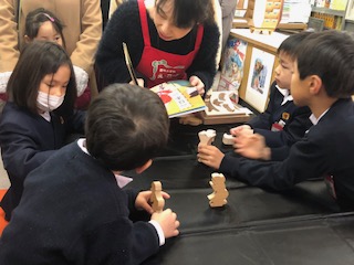 組み木遊びでは、絵本を読んでいただきながら、登場人物を動かして楽しみました。やさしい手触りでもっているだけでも心が和みます。