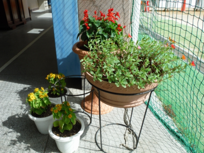 玄関前には,色鮮やかな花々が咲き誇っています。
