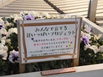 地域花いっぱいプロジェクトで,子どもたちが育てたパンジーが,大阪ターミナルビルのカリヨン広場を彩っています。お近くにお越しの際はぜひご覧ください。