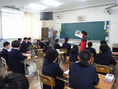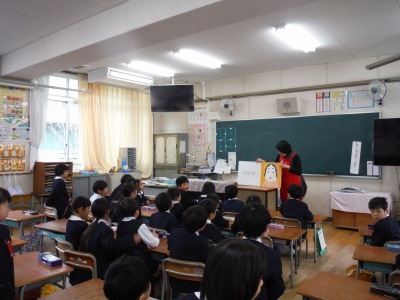 1年生は,大型絵本「おめんです」を読んでいただきました。1月の土曜授業での「おめんです2」の前作です。「やさいのおなか」は野菜の切り口をシルエットにしていて、それが何の野菜なのかを子どもたちが元気に答えていました。