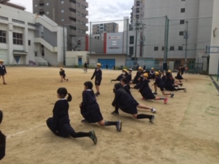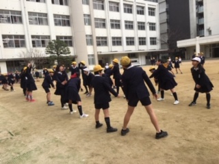 運動委員会で考えたストレッチを一曲の歌に合わせて行いました。