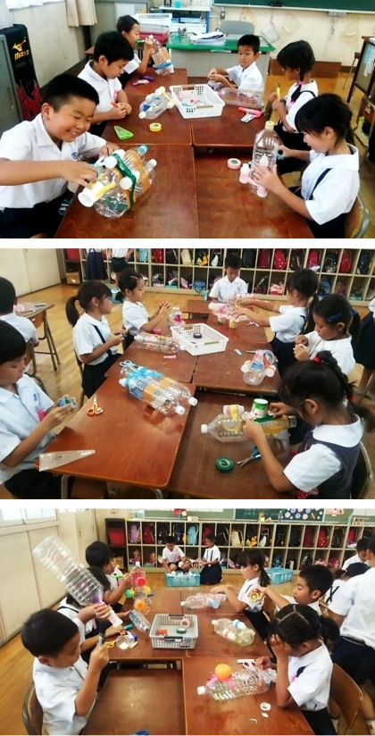 9月5日(金)のプール納めの後,1・2年生でプールにペットボトルやプラスチック容器でつくったおもちゃを浮かべて遊びます。