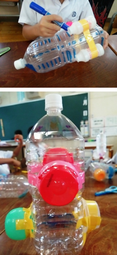ビニルテープやガムテープを使って,ペットボトルにプラスチック容器を貼り付け,ペンで色を塗ったり模様を描いたりしました。