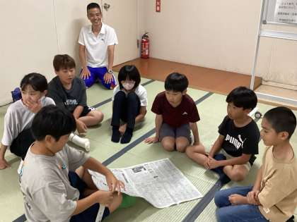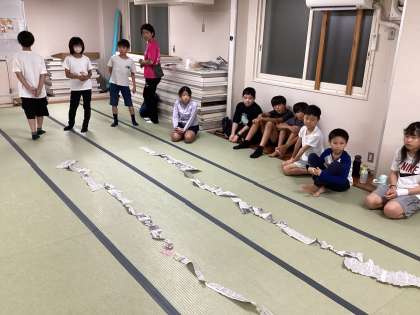 最後の競技は班のメンバー全員で、1枚の新聞紙をどれだけ長く手で切っていくかという競技でした。