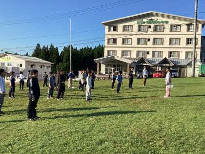 お宿の前の広場で、朝の会とラジオ体操をします。