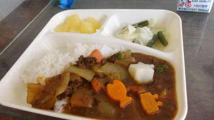 今日も調理員さんが、かわいい形をした「ラッキーにんじん」や「ラッキーじゃがいも」をカレーの中に入れてくださっています。
