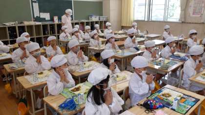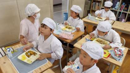 給食調理室は調理中、室温が40度ほどになり、調理員さんは大変な業務を日々されていますが、調理にさまざまな工夫をしてくださり、子どもたちにも積極的に声をかけてくださっています。