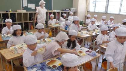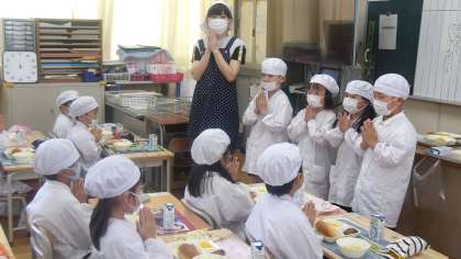 連日厳しい暑さが続き、子どもたちの食欲を心配した調理員さんが、今日も教室に様子を見に来てくださいました。