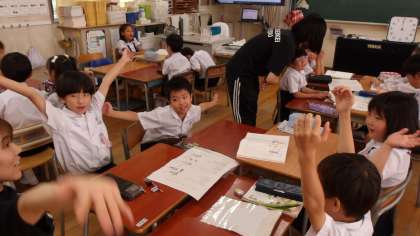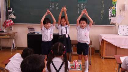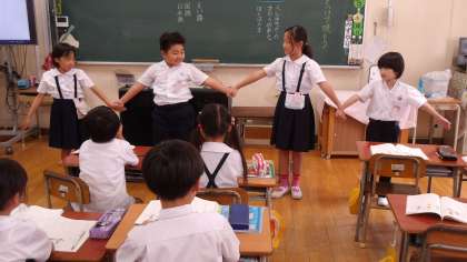 今日は教科書に載っている「空に ぐうんと 手を のばせ」という詩を、体を動かしながら読んでいくという学習をしました。