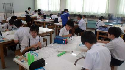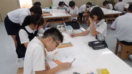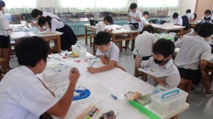 高学年で取り組んでいる平和ポスターの制作、6年生では水彩絵の具を使っての着色が始まりました。