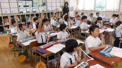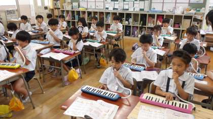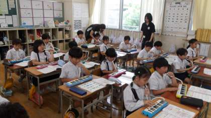 2年生は音楽の時間に「山のポルカ」の曲を鍵盤ハーモニカで練習しています。