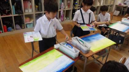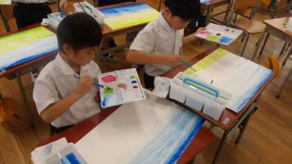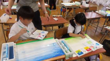 図画工作の時間に「えのぐ」の使い方を学習している2年生。