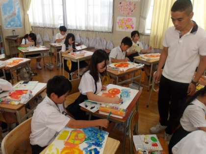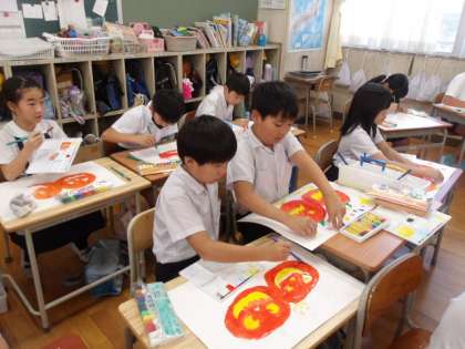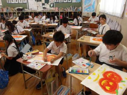 図画工作の時間に、ハロウィンの“かぼちゃ”を描いている4年生。