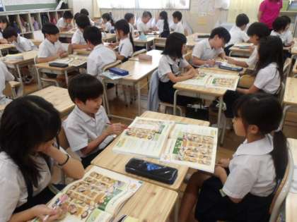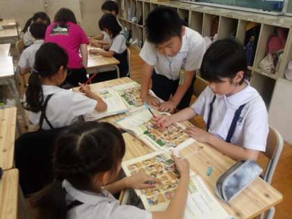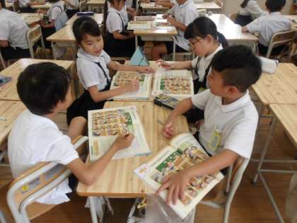 道徳の教科書に載っている、あるクラスの教室の様子の絵を見て、自分自身、クラスの友だちの心の声に耳をかたむけることができているか、考えていきます。