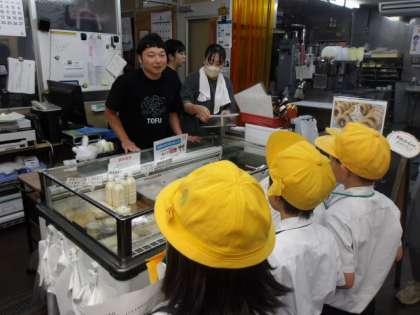 古くからこの地にお店を構えておられるお豆腐屋さんで、今日は豆腐のつくり方など、子どもたちに丁寧に教えてくださいました。また、販売する前の大きな大きなお豆腐も目の前で見せていただきました。