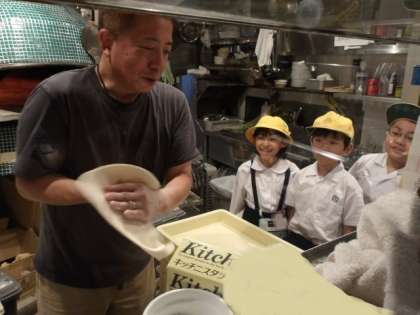 また、発酵させたピザ生地を手で回転させてまるい形にしていくところも間近で見せていただき、子どもたちは大喜びでした!