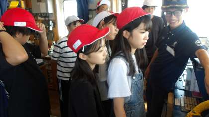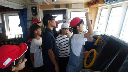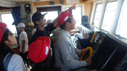「操舵室」を見学させてもらいます。船の進行方向を高い位置から眺めることができます。