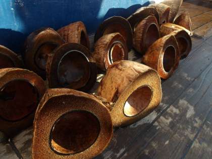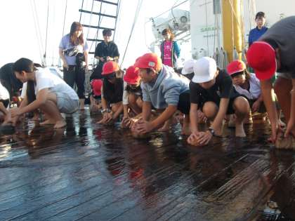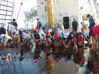 みらいへ乗船時の恒例行事、ヤシの実を使ってのデッキ磨きが始まりました!