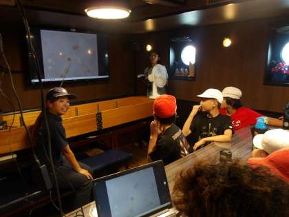 採取した海水を顕微鏡で調べ、どんなものが海水に混じっているのかモニターで確認をします。