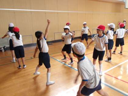 みんなで踊るダンス、先に学習を進めていた4年生の“先輩”が、“後輩”である3年生に優しく教えてくれていました!