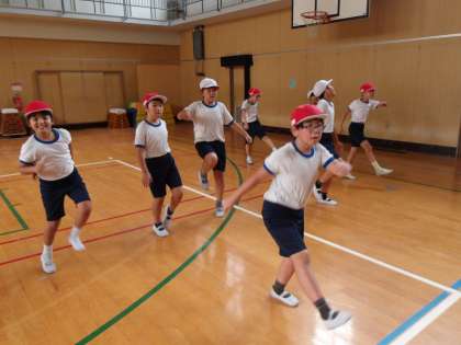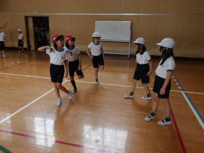 3年生と4年生が体育館で運動会の練習をしていました。