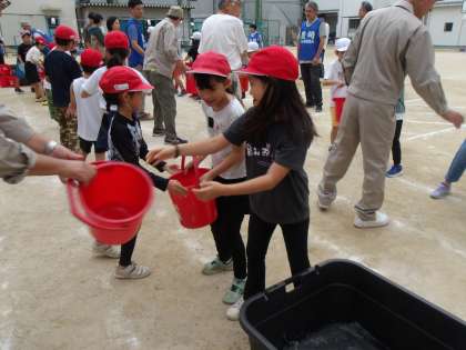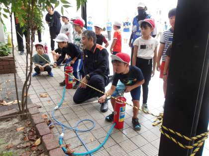また、実際に水消火器を使った噴射やバケツリレーの仕方など、楽しく体験できるようプログラムをつくってくださり、子どもたちは楽しい時間を過ごしながら、防災について学ぶことができました。
