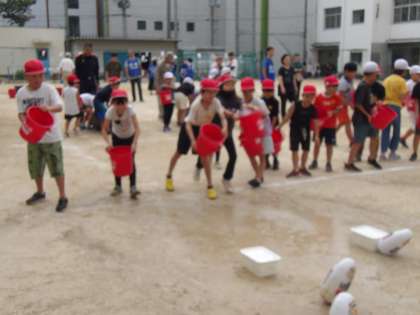今日は豊崎小学校の運動場で、豊崎青少年指導員連絡協議会のみなさまが主催される「防災&水鉄砲大会」が行われました。