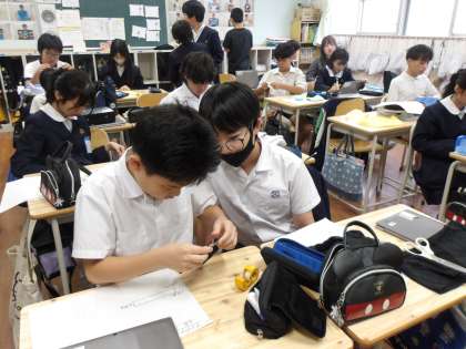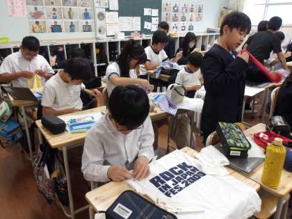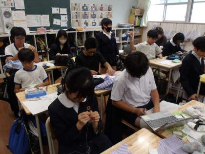 6年生は家庭科の時間に、これまで学習してきた裁縫の技術を生かし、使わなくなった古着などを材料にして“リメイク作品”づくりをスタートしています。