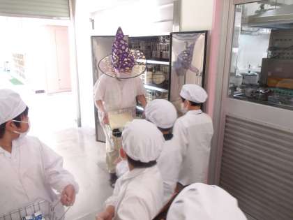 まもなく「ハロウィン」ということで、今日は給食調理員さんが“魔女”の帽子をかぶって子どもたちを迎えてくださいました!