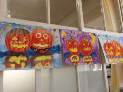 4年生の教室には、子どもたちが描いた「ハロウィン」のかぼちゃの絵が飾られています。