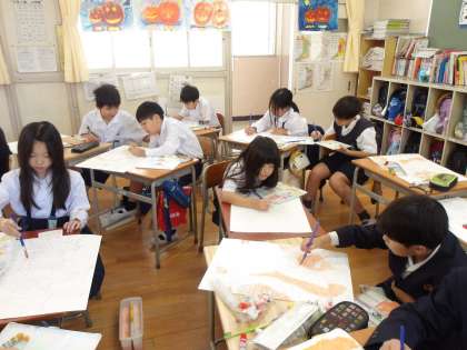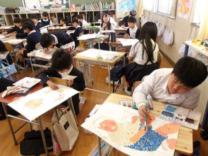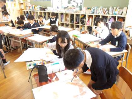 4年生は図画工作の時間に、「点描」の技法を使った絵画制作が進んでいます。