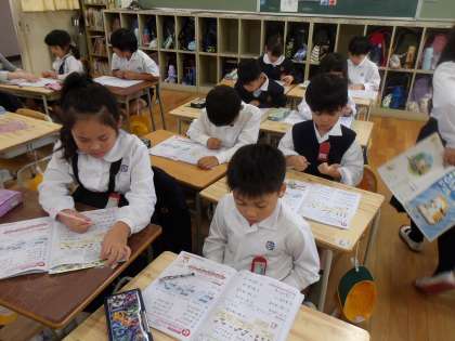 算数の時間に「3つのかずのけいさん」を学習している1年生。