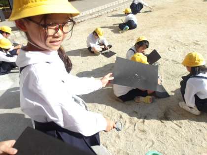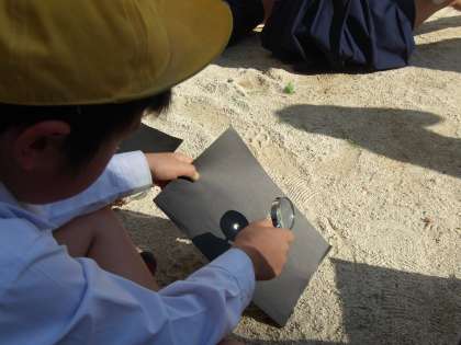 虫眼鏡で日光を集めるとどうなるか、今日は運動場に出て実験をしました。