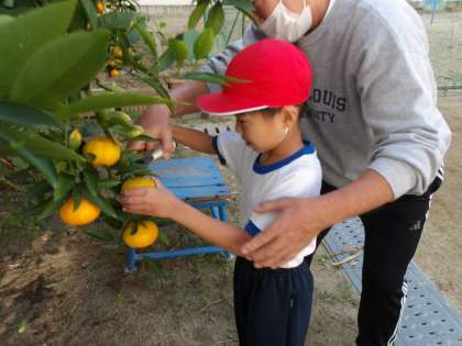 今日は1年生が「みかんがり」体験ということで、自分で選んだみかんの実を1つ持ち帰ります。