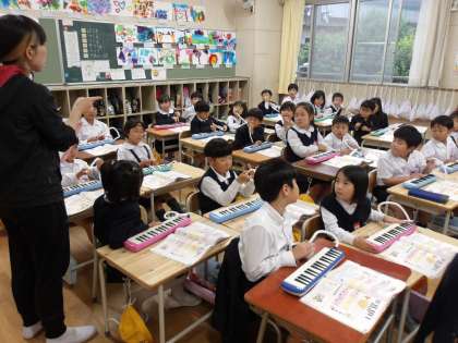 1年生の教室から素敵な歌声と演奏が聞こえてきます…。