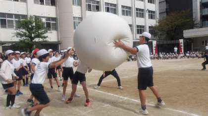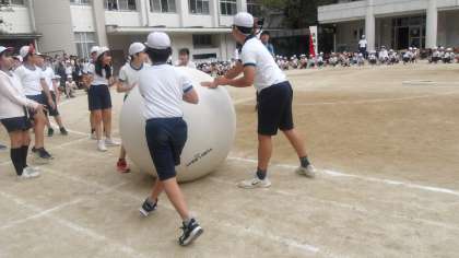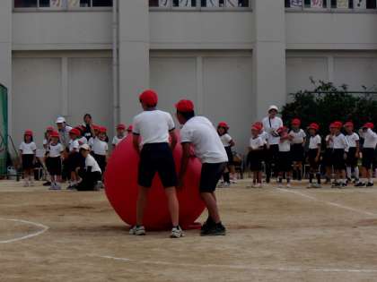 1年生から6年生までが全員参加し、赤白どちらが早く大玉をゴールさせるかを争います。
