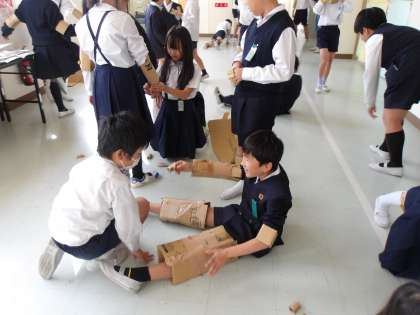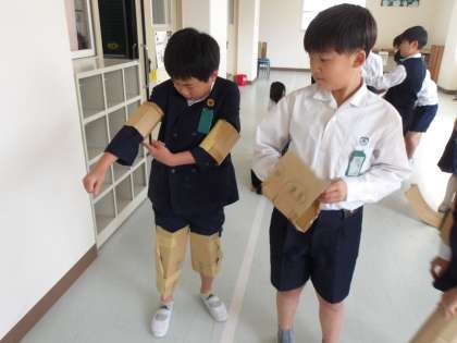 今日は段ボールやペットボトルで作った「関節ナイナイマシーン(手足の関節を動かなくするギプスのようなもの)」を使って、ヒトの「関節」のはたらきについて考えました。
