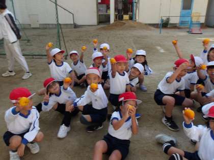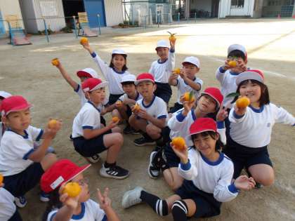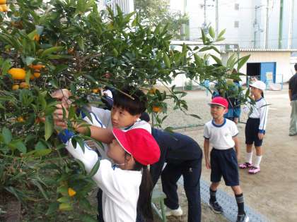 先日は1年生が“みかんがり”をしましたが、まだまだたくさんの実がついているため、今日は2年生が“みかんがり”を楽しみました!