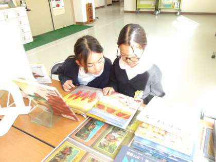 職員室前のスペースで、新しく入った本を読む子どもたちもいました。