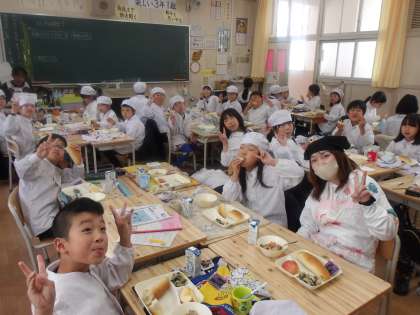 りんごは学年によって、子どもたちが食べやすいように給食調理員さんがカットしてくださっています。