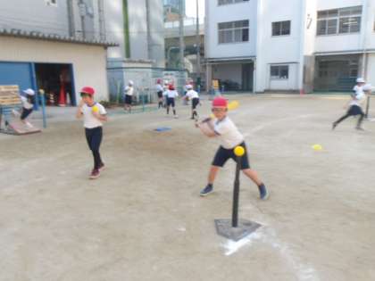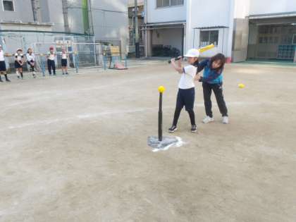 3年生が体育の時間に「ティー・ボール」の学習をしていました。