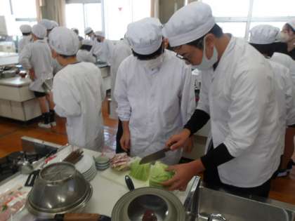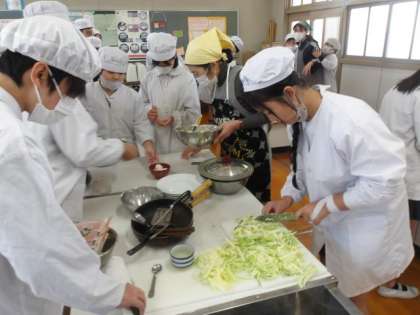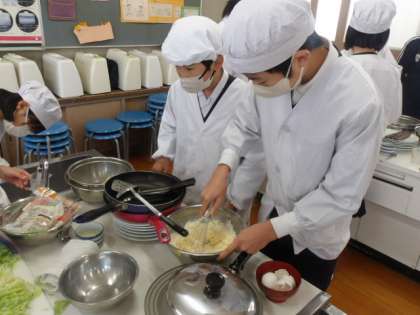 班のメンバーで役割分担をし、具材を切ったり、生地を混ぜたりと、みんなで協力しながら「お好み焼き」を作っていきます。