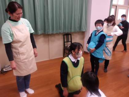 妊婦さん体験のコーナーでは、おなかにおよそ3kgの重しを巻き付け、普段なら簡単にできるような動きも、妊婦さんにとっては大変なことがたくさんあることが分かりました。