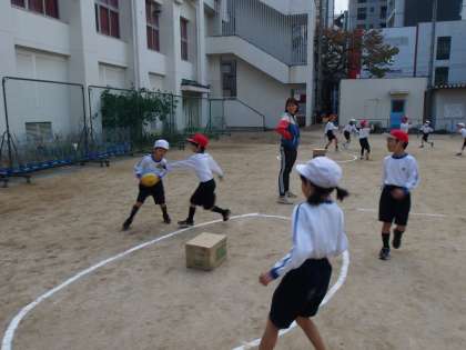 バスケットボールとラグビーを合わせたようなゲームで、相手チームの的にボールを当てると得点になります。