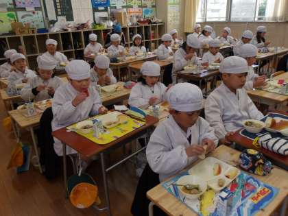 りんごは1人1/4個提供されますが、1年生には子どもたちが食べやすいよう、1/8にしたものを2個用意していただきました。